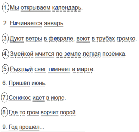 1. Мы открываем к_лендарь. 2. Н_чинается январь. 3. Дуют ветры в ф_врале, воют в трубах громко. 4. Змейкой мчится по з_мле лёгкая позёмка. 5. Рыхл_й снег т_мнеет в марте. 6. Пришёл июнь. 7. Сен_кос идёт в июле. 8. Где-то гром ворчит порой. 9. Год прошёл...