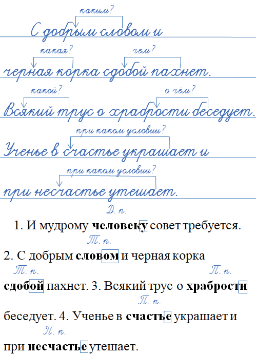 Словосочетания: 1. Мудрому человеку, требуется человеку. 2. С добрым словом, чёрная корка, пахнет сдобой. 3. Всякий трус, беседует о храбрости. 4. В счастье украшает, утешает при несчастье.
