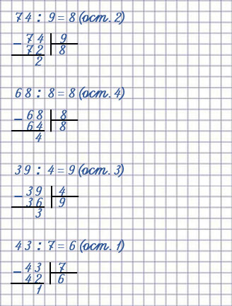 74 : 9 = 8 (ост. 2) 39 : 4 = 9 (ост. 3)