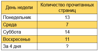 14. Дима прочитал книгу за 4 дня. Количество страниц, которые он прочитывал за день, Дима записал в такой таблице: