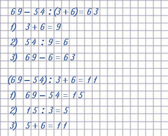 69 - 54 : (3 + 6) = 69 - 54 : 9 = 69 - 6 = 63