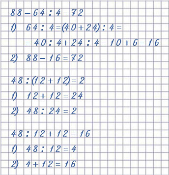64 : 4 = (40 + 24) : 4 = 40 : 4 + 24 : 4 =