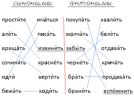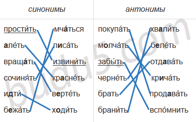 Прочитайте. Соедините линиями синонимы и антонимы в каждой группе глаголов. Обозначьте в словах ударение.
