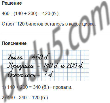 4. В кассе цирка было 460 билетов. В субботу продали 140 билетов, а в воскресенье ещё 200. Сколько билетов осталось в кассе цирка?
