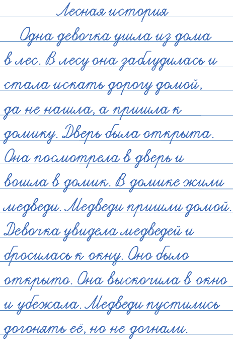 Одна девочка (у)шла (из)дома (в)лес. (В)лесу она (за)блудилась и стала искать дорогу домой, да не (на)шла, а (при)шла (к)домику. Дверь была (от)крыта. Она (по)смотрела (в)дверь и (во)шла (в)домик. (В)домике жили медведи. Медведи (при)шли домой. Девочка (у)видела медведей и бросилась (к)окну. Оно было (от)крыто. Она (вы)скочила (в)окно и (у)бежала. Медведи пустились (до)гонять её, но не (до)гнали.
