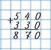 | 540 + 330 = 870 | 90 : 15 • 13 = 78 |