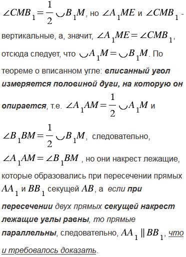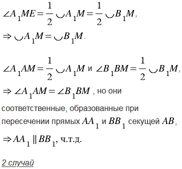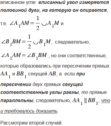 Две окружности имеют единственную общую точку М. Через эту точку проведены две секущие, пересекающие одну окружность в точках А и А1, а другую - в точках В и В1. Докажите, что АА1