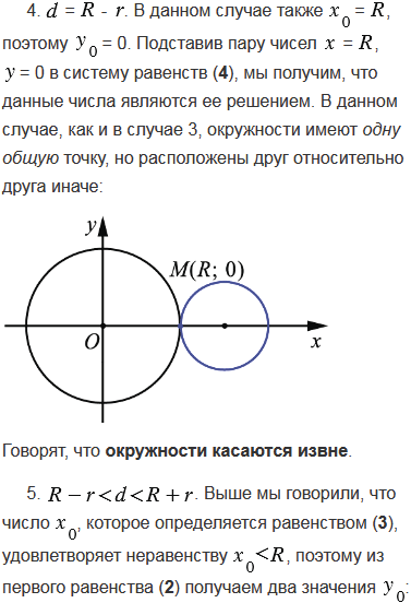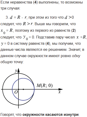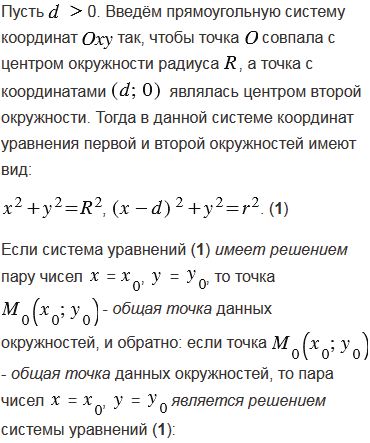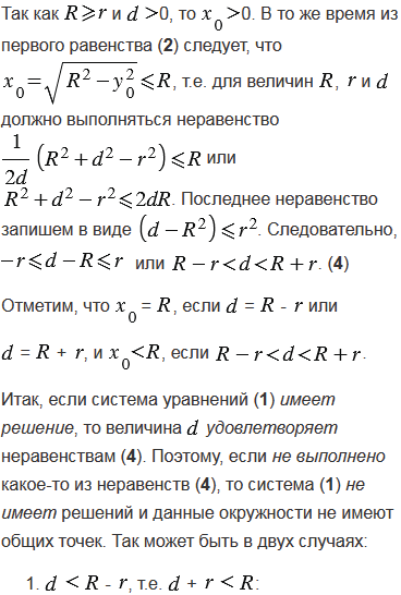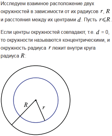 Исследуйте взаимное расположение двух окружностей в зависимости от их радиусов и расстояния между их центрами. Сформулируйте полученные выводы.