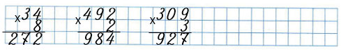 Умножаю десятки: 3 • 8 = 24. К 24 дес. прибавляю 3 дес., который получен при умножении единиц: 24 + 3 = 27. 27 дес. - это 2 сот. 7 дес., 7 дес. пишу под десятками, а 2 сот. запишу в ответ в разряд сотен, так как сотен для умножения нет.