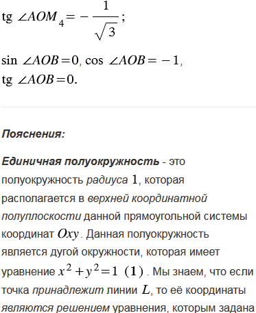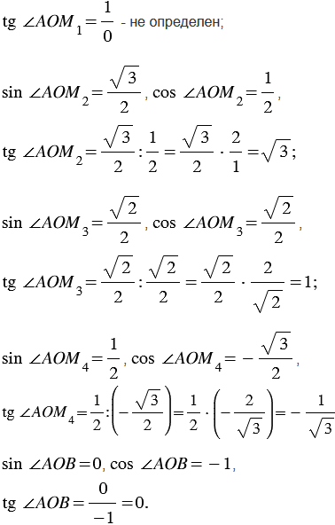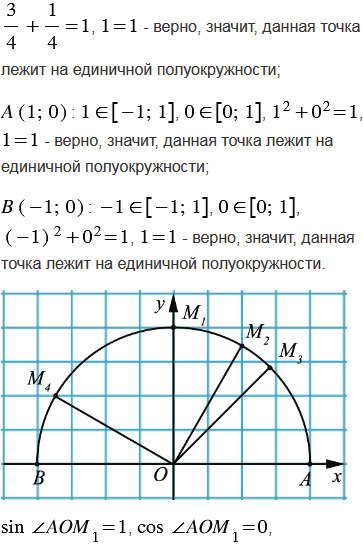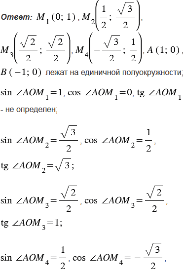 лежат на единичной полуокружности. Выпишите значения синуса, косинуса и тангенса углов АОМ1, АОМ2, АОМ3, АОМ4, АОВ.
