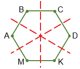 Все ли оси симметрии этой фигуры он провел? Запиши названия тех отрезков, которые будут осями симметрии шестиугольника АВСDKM и которых нет на чертеже.
