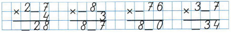 4) При умножении числа 7 на неизвестное число в единицах получилось 4. Это число - 2. 7 • 2 = 14. 1 дес. прибавим к десяткам после умножения десятков.
