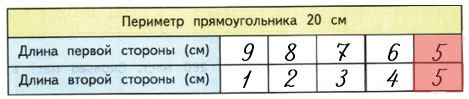 38. 1) Запиши в таблице, какими могут быть длины двух разных сторон прямоугольника, если его периметр равен 20 см.