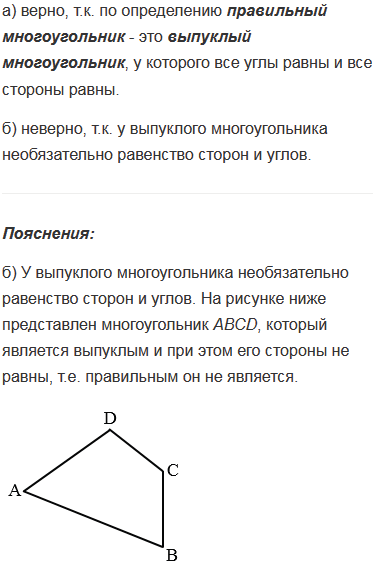 Верно ли утверждение: а) любой правильный многоугольник является выпуклым; б) любой выпуклый многоугольник является правильным? Ответ обоснуйте.