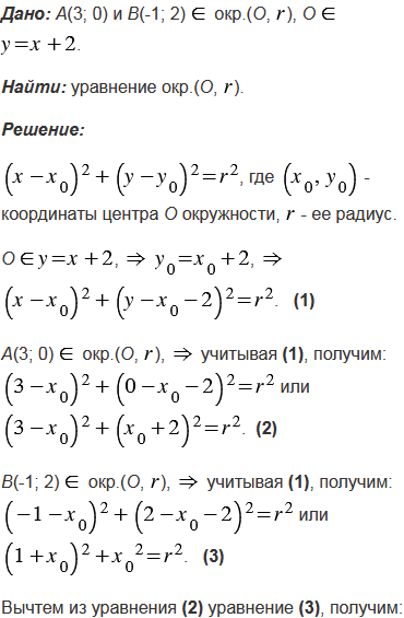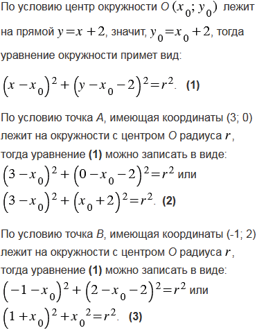 Напишите уравнение окружности, проходящей через точки А(3; 0) и В(-1; 2), если центр ее лежит на прямой
