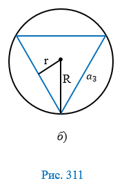 На рисунке 311, б изображен правильный треугольник, вписанный в окружность радиуса R. Перечертите таблицу в тетрадь и заполните пустые клетки (