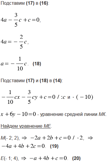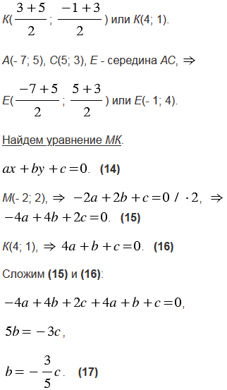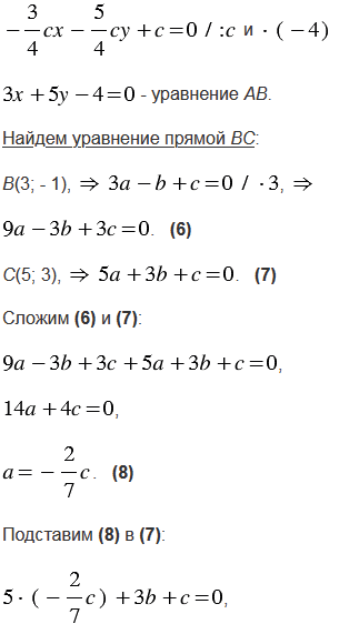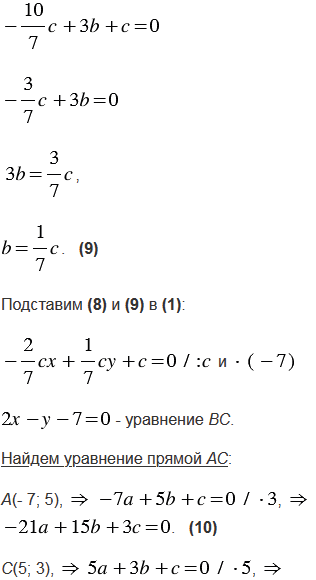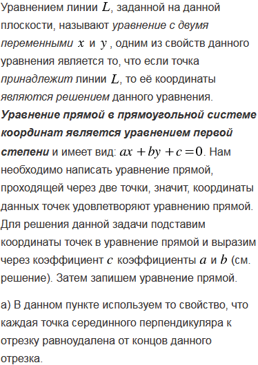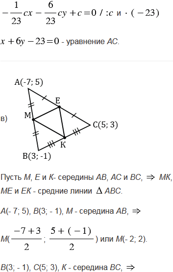 Вершины треугольника АВС имеют координаты А(- 7; 5), В(3; - 1), С(5; 3). Составьте уравнения: а) серединных перпендикуляров к сторонам треугольника; б) прямых АВ, ВС и СА; в) прямых, на которых лежат средние линии треугольника.