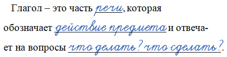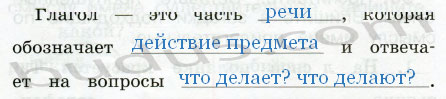 Глагол - это часть __, которая обозначает __ и отвечает на вопросы __ .