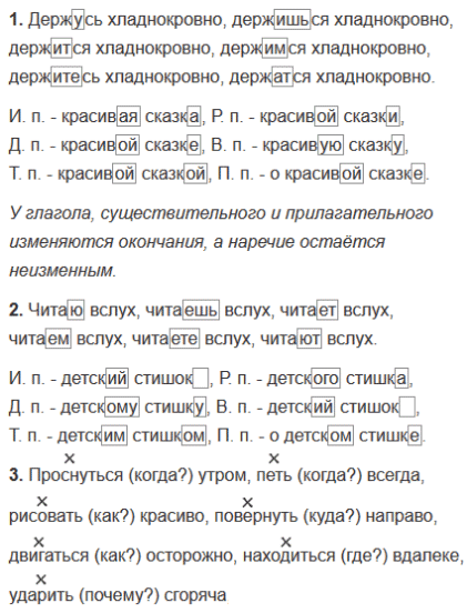 2. На примерах покажите, что глагол, имя существительное, имя прилагательное — изменяемые части речи, а наречие — неизменяемая часть речи.