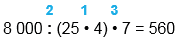 1) 25 • 4 = 100 2) 8 000 : 100 = 80 3) 80 • 7 = 560 |