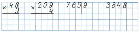 Умножаю десятки: 4 • 9 = 36. К 36 дес. прибавляю 7 дес., которые получены при умножении единиц: 36 + 7 = 43. 43 дес. - это 4 сот. и 3 дес., 3 дес. пишу под десятками, а 4 сот. запишу под сотнями, так как других сотен для умножения нет.