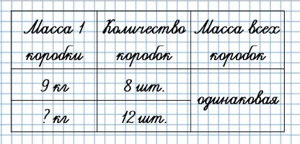 54. Масса 12 одинаковых по массе коробок с изюмом такая же, как масса 8 одинаковых по массе коробок с черносливом. Найди массу одной коробки с изюмом, если масса коробки с черносливом 9 кг.