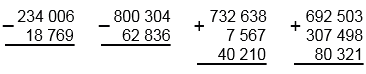 Пишу (единицы под единицами, десятки под десятками, сотни под сотнями, единицы тысяч под единицами тысяч, десятки тысяч под десятками тысяч): 800 304 - 62 836.