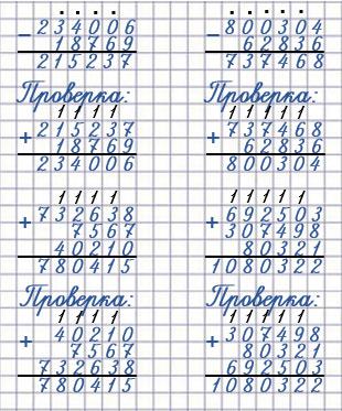 Пишу (единицы под единицами, десятки под десятками, сотни под сотнями, единицы тысяч под единицами тысяч, десятки тысяч под десятками тысяч): 234 006 - 18 769.