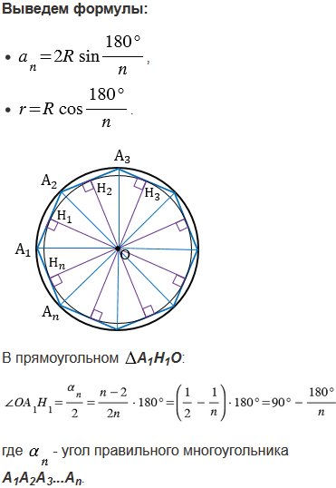 Выведите формулы для вычисления стороны правильного -угольника и радиуса вписанной в него окружности через радиус описанной окружности.