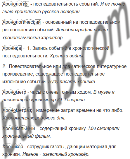 Хроно... (гр. хро́нос — время): хроноло́гия, хроно-логи́ческий, хро́ника, хроно́метру хронометра́ж, хроника́льный, хроникёр.
