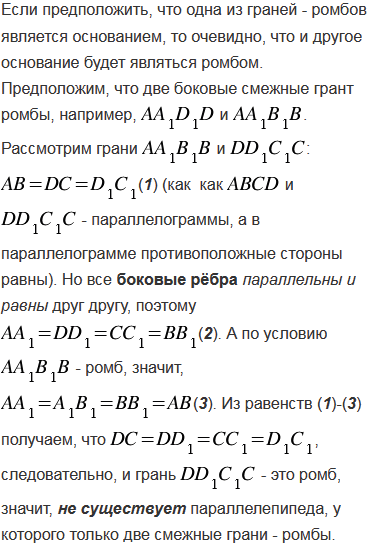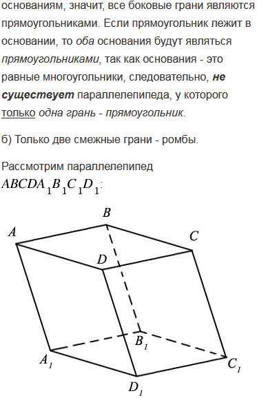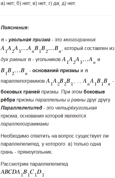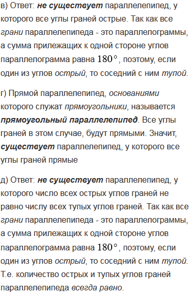 Существует ли параллелепипед, у которого: а) только одна грань - прямоугольник; б) только две смежные грани - ромбы; в) все углы граней острые; г) все углы граней прямые; д) число всех острых углов граней не равно числу всех тупых углов граней?