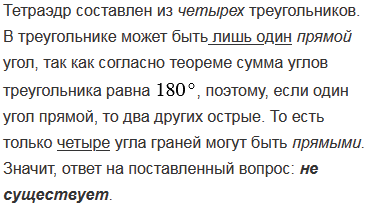 Существует ли тетраэдр, у которого пять углов граней - прямые?