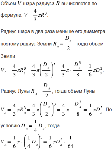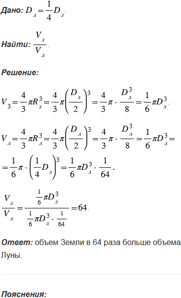 Диаметр Луны составляет (приближенно) четвертую часть диаметра Земли. Сравните объемы Луны и Земли, считая их шарами.
