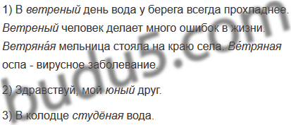 1) Ветр..ый день, ветр..ый человек, ветр..а́я мельница, ве́тр..ая оспа. 2) Ю(н, нн)ый друг. 3) Студё..ая вода.