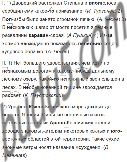 I. 1) Дворецкий растолкал Степана и (впол) голоса сообщил ему какое (то) приказание. (И. Тургенев) 2) (Пол) избы было занято огромной печью. (А. Чехов) 3) В (не) скольких шагах от моста посетил я тёмные развалины (караван) сарая. (А.Пушкин) 4) Из (за) холмов (не) ожиданно показалось (пепельно) седое кудрявое облачко. (А. Чехов)