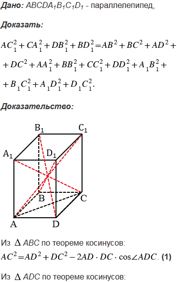 Докажите, что сумма квадратов четырех диагоналей параллелепипеда равна сумме квадратов двенадцати его ребер.