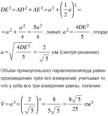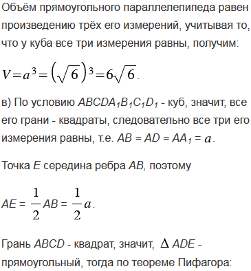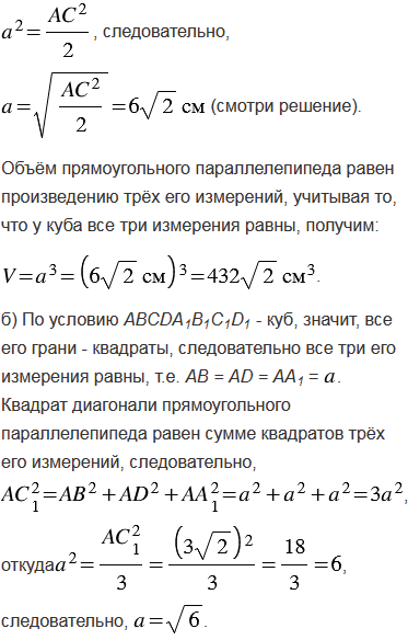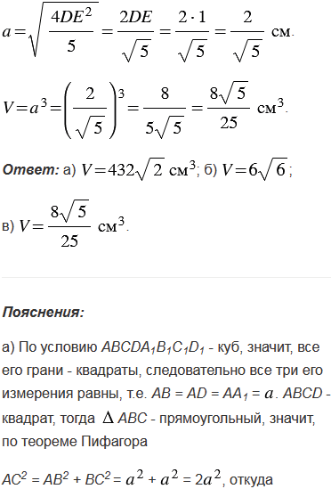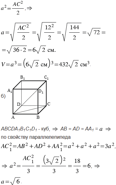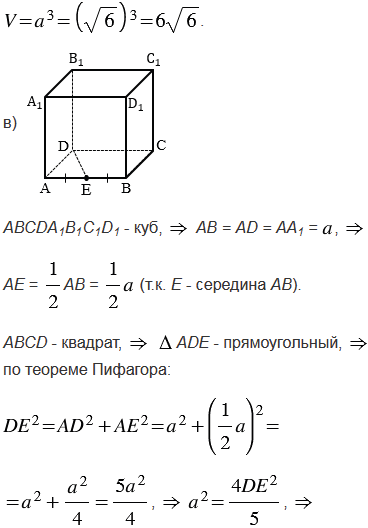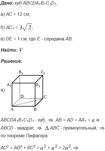 Найдите объем куба АВСDА1В1С1D1, если: а) АС = 12 см; б) АС1 = ; в) = 1 см, где Е - середина ребра АВ.