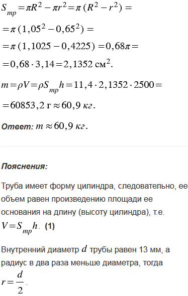 Свинцовая труба (плотность свинца 11,4 г/см3) с толщиной стенок 4 мм имеет внутренний диаметр 13 мм. Какова масса трубы, если ее длина равна 25 м?