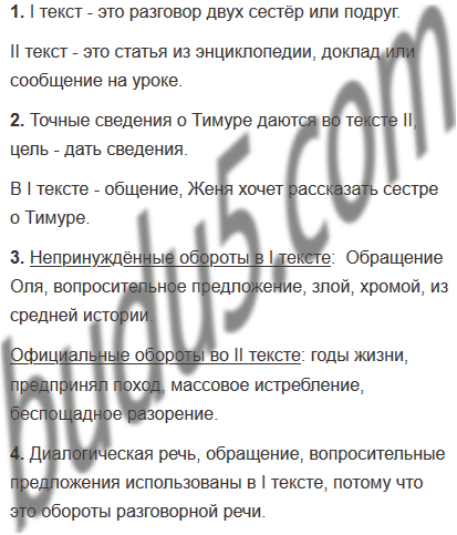 2. Сравните содержание текстов. В каком из них мы находим точные сведения о Тимуре? Каковы задачи речи в том и другом случае? (Вспомните повесть А. Гайдара. С какой целью Женя заводит с сестрой разговор о Тимуре? Ей действительно нужны сведения об этой исторической личности или ей не терпится поделиться впечатлениями о встрече с таинственным, незнакомым мальчиком?)