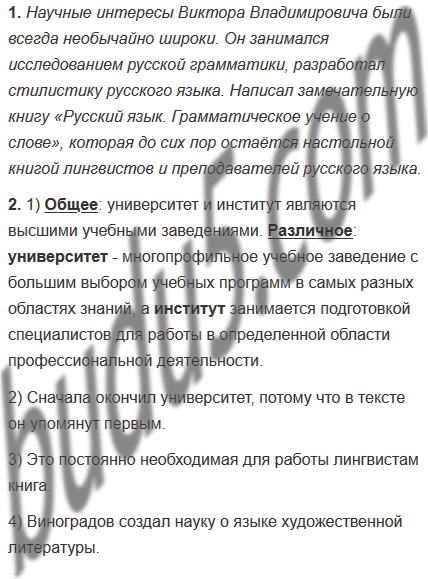 2. Ответьте на вопросы: 1) «Университет» и «институт» — что общего у этих понятий и чем они различаются? 2) Что раньше окончил В. В. Виноградов — университет или институт? Какие свидетельства этого имеются в тексте? 3) Как вы понимаете выражение настольная книга лингвистов? 4) Какое новое научное направление в лингвистике создал В. В. Виноградов?