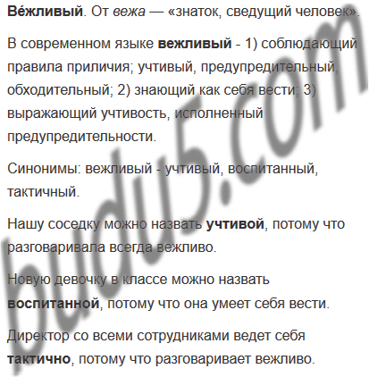 3. Используя словарик синонимов, составьте и запишите предложения так, чтобы в них раскрывалась особенность лексического значения каждого синонима прилагательного вежливый.