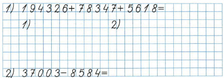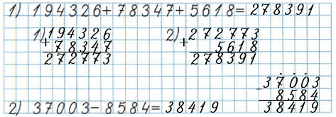 Пишу (единицы под единицами, десятки под десятками, сотни под сотнями, единицы тысяч под единицами тысяч, десятки тысяч под десятками тысяч): 194326 + 78347.