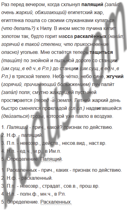 1) Раз перед вечером, когда схлынул п..лящий египетский жар, египтянка пошла со своими служанками купа(т, ть)ся к Нилу. (Н.Лесков) 2) В ином месте пучина кипит золотом так, будто горит ма(с, сс)а раск..лённых угольев. (И. Гончаров) 3) Мне остаётся теперь т..щиться по знойной и пыльной дороге со станци.. до станци.. в тряской телеге. (И. Тургенев) 4) Небо чётко, небо сине, жгучий луч п..ли́т поля; смутно жаждущей пустыней прост..рается земля. (В. Брюсов) 5) Летний жаркий день быстро сменялся пр..хладой надв..гавшейся грозы, которой уже пахло в воздухе. (Д. Мамин Сибиряк)