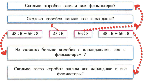 8. 1) Прочитай условие задачи: 48 карандашей разложили по 6 карандашей в каждую коробку, а 56 фломастеров - по 8 фломастеров в каждую коробку.
