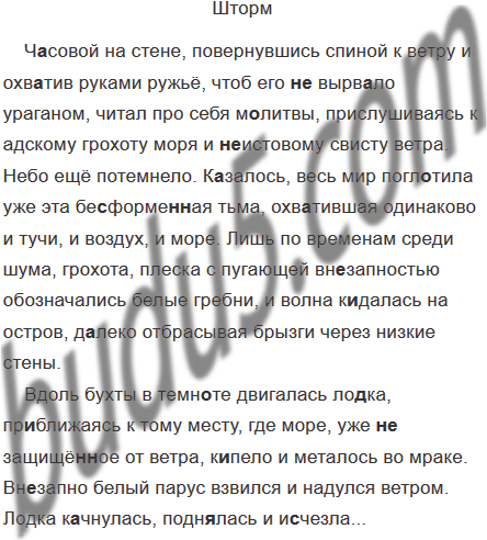 Вдоль бухты в темн..те двигалась ло..ка пр..ближаясь к тому месту, где море уже (не) защищё(н, нн)ое от ветра к..пело и металось во мраке. Вн..запно белый парус взвился и надулся ветром. Лодка к..чнулась подн..лась и и..чезла...