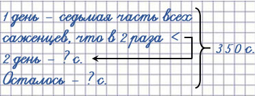 430. Рабочие должны посадить 350 саженцев кустов. В первый день они посадили одну седьмую часть всех саженцев. Это в 2 раза меньше, чем во второй день. Поставь вопрос и реши задачу.