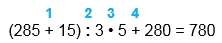 1) 285 + 15 = 300 2) 300 : 3 = 100 3) 100 • 5 = 500 4) 500 + 280 = 780 |