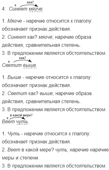 4. Пользуясь образцами на с. 96—97, проведите морфологический разбор по одному наречию образа действия, меры и степени, места, времени.