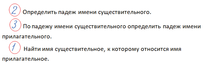 Прочитайте. Укажите цифрами в кружках последовательность определения падежа имени прилагательного в предложении.