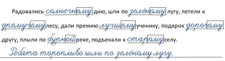 Радовались ___ дню, шли по ___ лугу, летели к ___ лесу, дали премию ___ ученику, подарок ___ другу, плыли по ___ реке, подъехали к ___ селу.